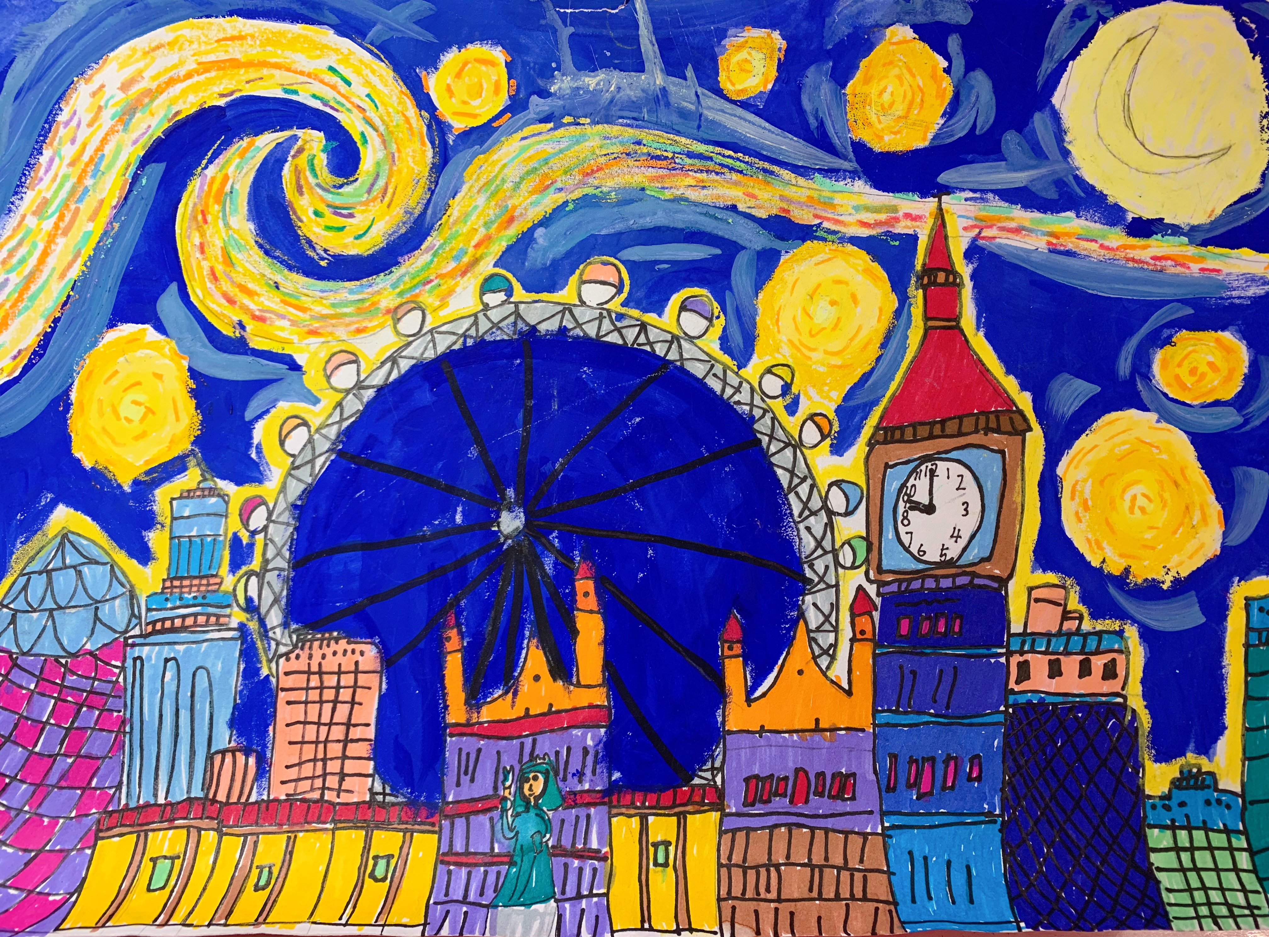 寓意:此畫是小作者根據(jù)梵高的《星月夜》所創(chuàng)。小作者通過《星月夜》得到靈感,用了漸變藍色系的月光色和彩虹般絢爛的煙花,明亮的月光,還有照耀世界的自由女神像,明亮又充滿人間煙火氣的溫暖的樓宇和房屋,還有小作者喜歡的彩色摩天輪勾畫了屬于她心中美好的《城市月夜》。雖然不同的人面對梵高的《星月夜》這幅曠世之作會有不同的理解,雖然誰也無法弄清楚梵高真正的創(chuàng)作意圖,但是他帶給我們對繪畫表現(xiàn)手法的探索與執(zhí)著,給予了我們無限的思索和啟迪。