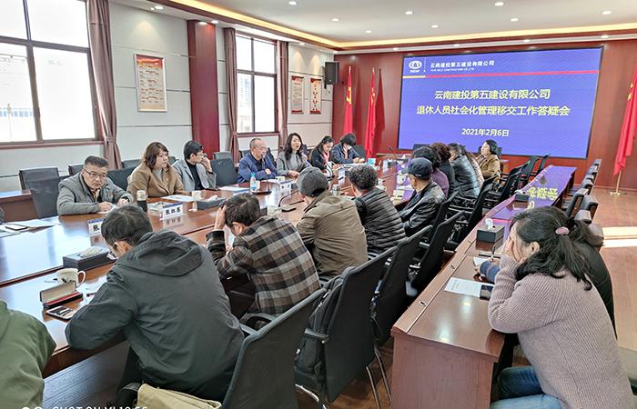 2月6日上午,臨近新春佳節(jié)之際,退管會在公司黨委和工會的指導(dǎo)幫助下,邀請五華區(qū)黑林鋪社區(qū)主任楊濤、眠山社區(qū)主任馬懿潔和副主任張紅恩到公司黨建活動室召開了公司退休人員社會化管理移交工作答疑會。